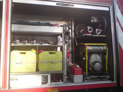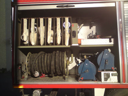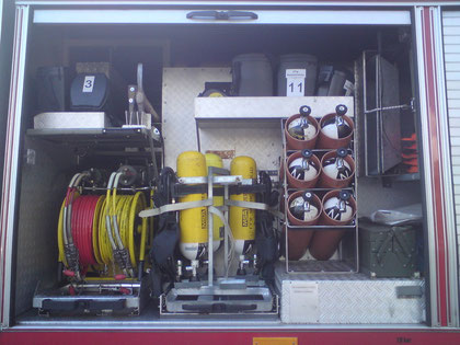 Motorpumpenaggregat mit Spreizer und Schneidgerät, 4 Atemschutzgeräte, 6 Pressluftflaschen, Feuerwehräxte, 12 Sauerstoffmasken, Werkzeugkasten, Mulden,