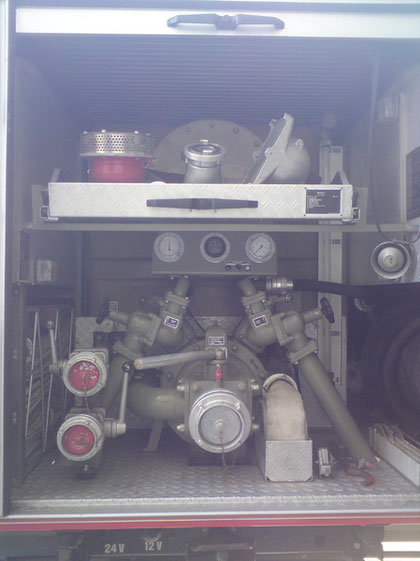 eingebaute Pumpe Bachert mit einer Nennförderung von 1600 l/min. Saugkorb, Sammelstück, Tiefsaugkorb, Saugschutzkorb, Übergangsstück A-B, Feuerwehrleinen