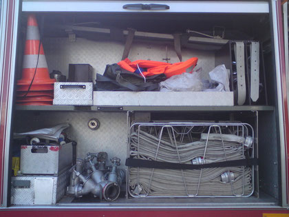 Stromerzeuger 5 kVA, 6 Schaummittelbehälter, Schaumstrahlrohr M, Schaumstrahlrohr S, Zumischer, Standrohr, Kübelspritze, Reservekanister, 2 Strahlrohre B, 3 Strahlrohre C, 1 Strahlrohr D, Kanalratte, Hydrantenschlüssel, Schnittschutzhosen,