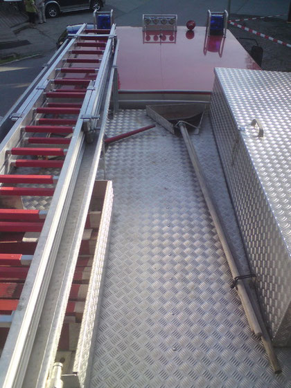 Besen, Harken, Leiter, Schlauchbrücken, Ölbindemittel,