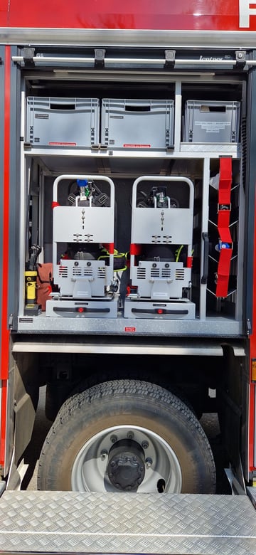 Ausrüstung zur Waldbrandbekämpfung, Wasserwerfer, mobile Löscheinrichtungen, technische Beleuchtung, 4 Atemschutzgeräte, Schlauchmaterial, Schnellangriffe, Hohlstrahlrohre, Benetzungsmittel, Faltbehälter für 3000 Liter Löschwasser